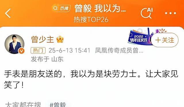 却被解读为“推卸责任”“谎言拙劣”“毫无悔意”,瞬间引爆全网群嘲! 被“点名”的劳力士立刻出面划清界限,不敢沾边。 短时间内,曾毅被舆论彻底围剿,不少人将曾毅戴不雅手表的行为上升为“劣迹艺人”。 工作室以“艺人健康状况不佳”为由,演唱会巡演被迫按下暂停键。
